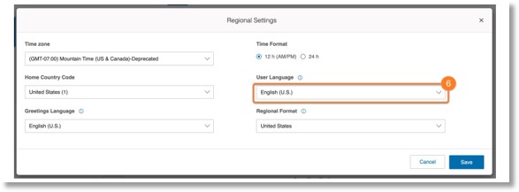6. Click the User Language dropdown, then select your preferred language. The Greetings Language and Regional Format selections will automatically change to the language you’ve chosen.